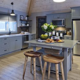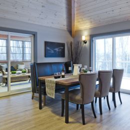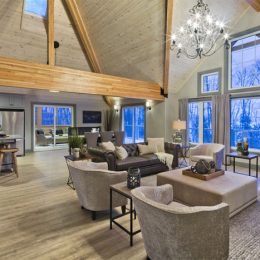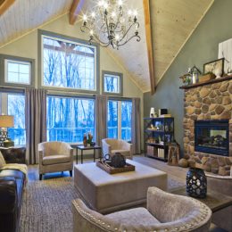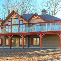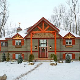 This charming Linwood home package features expansive open living areas with beautiful exposed glulam beams throughout. The main floor includes a spacious master bedroom suite, and a large covered porch that extends the living space outdoors. View full details: Selwyn Custom Cedar Homes.