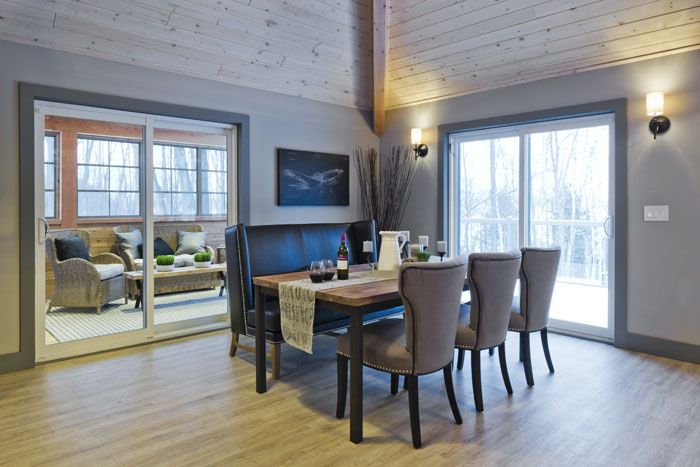 This charming Linwood home package features expansive open living areas with beautiful exposed glulam beams throughout. The main floor includes a spacious master bedroom suite, and a large covered porch that extends the living space outdoors. View full details: Selwyn Custom Cedar Homes.