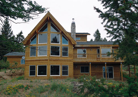 Designed for a sunny landscape, the Colorado custom home design has wide appeal. This post and beam, cedar home offers a unique dining/sitting area.