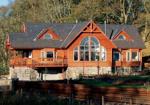 Designed by Linwood, this post and beam home package was built in Scotland. This country cedar home blends wonderfully with its rural setting.