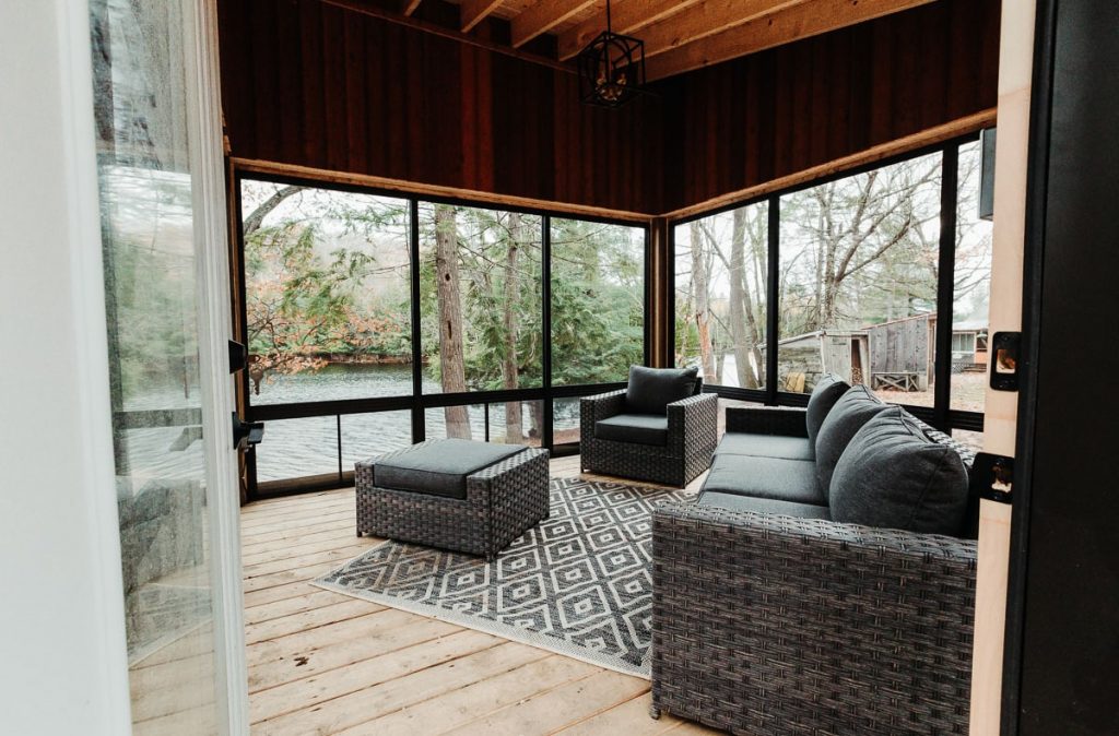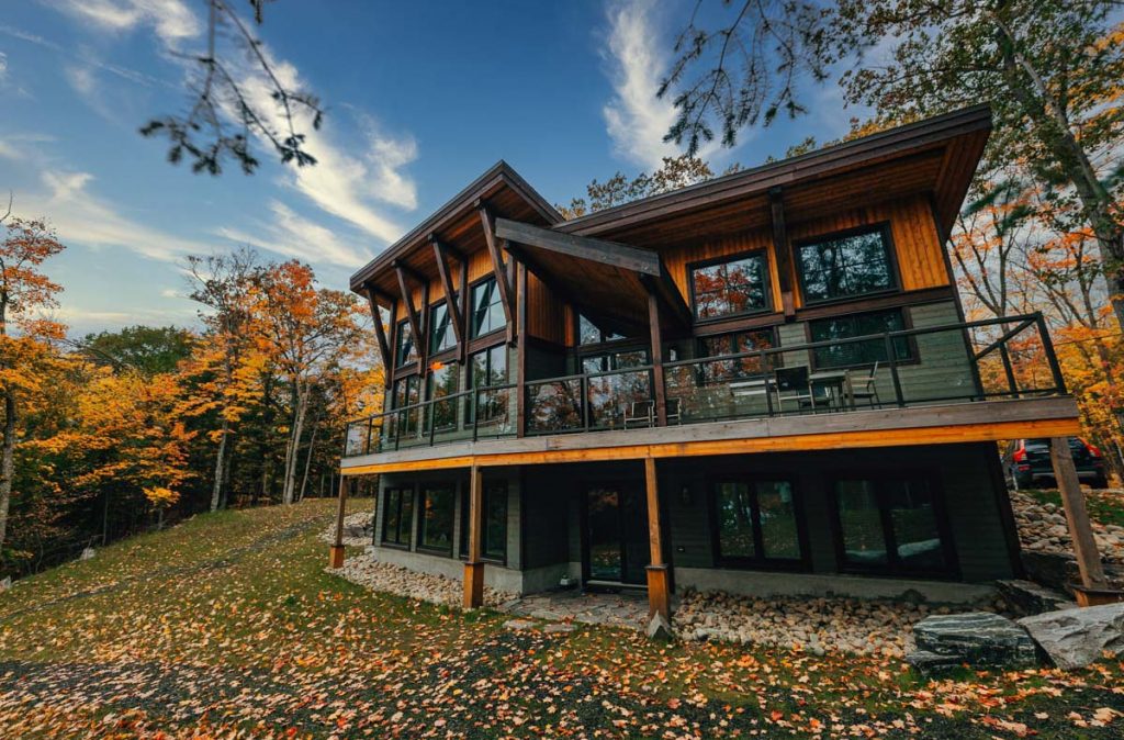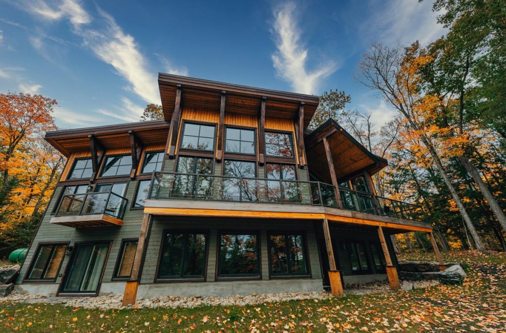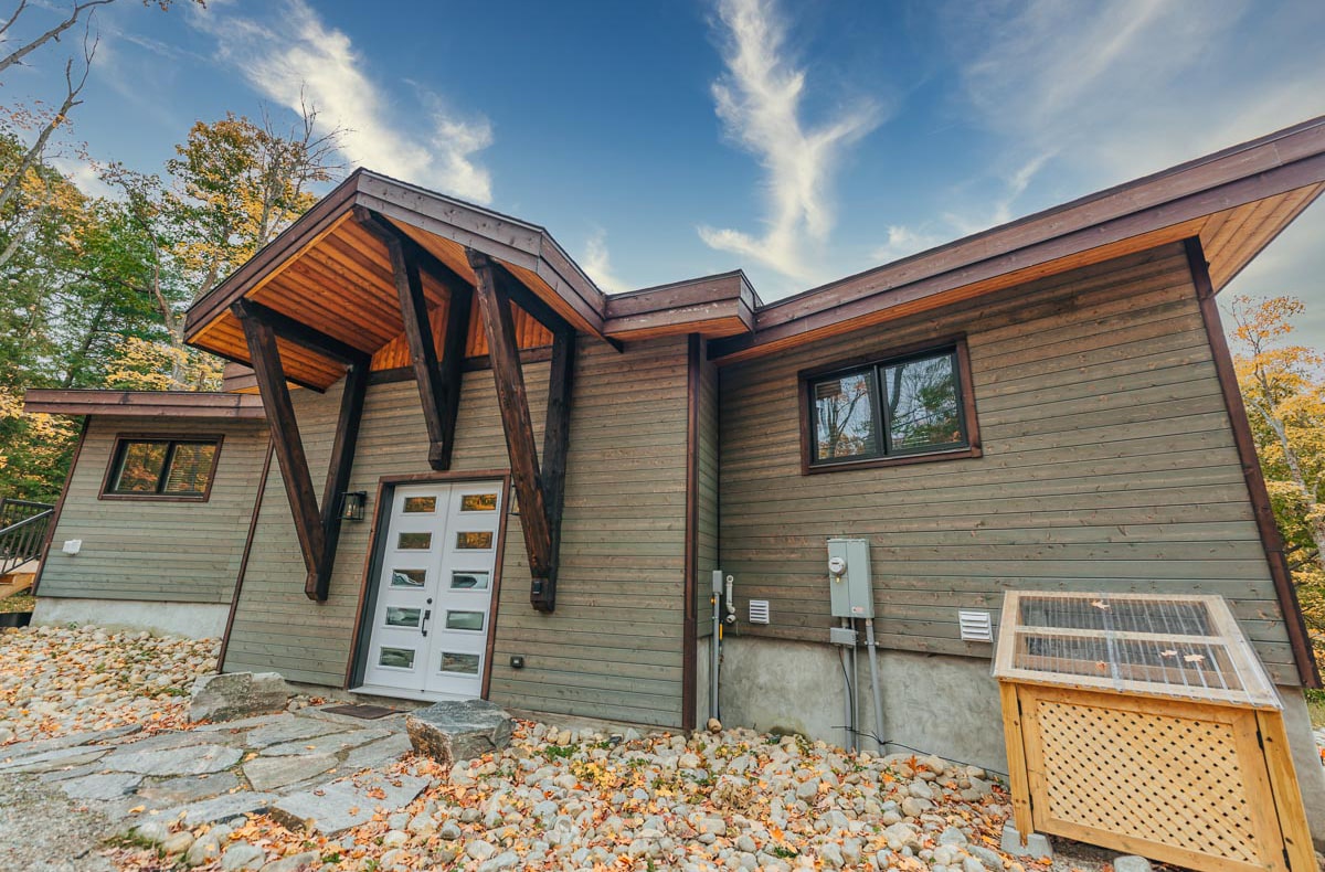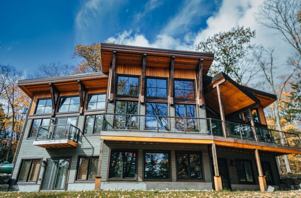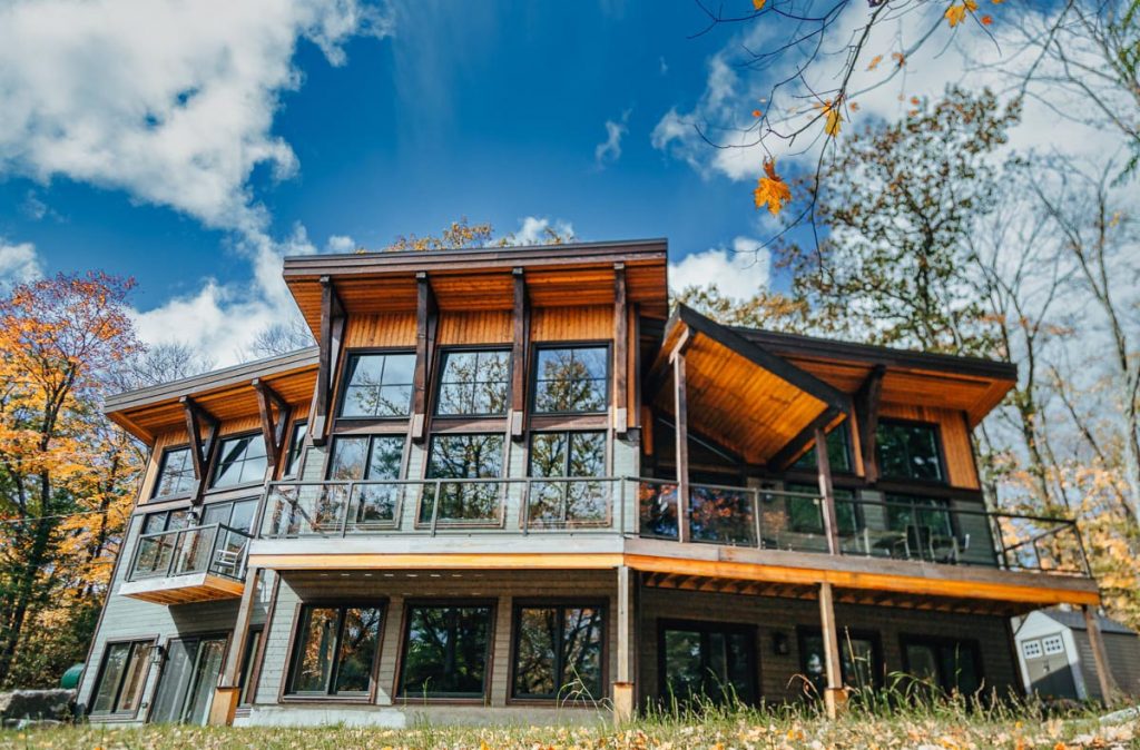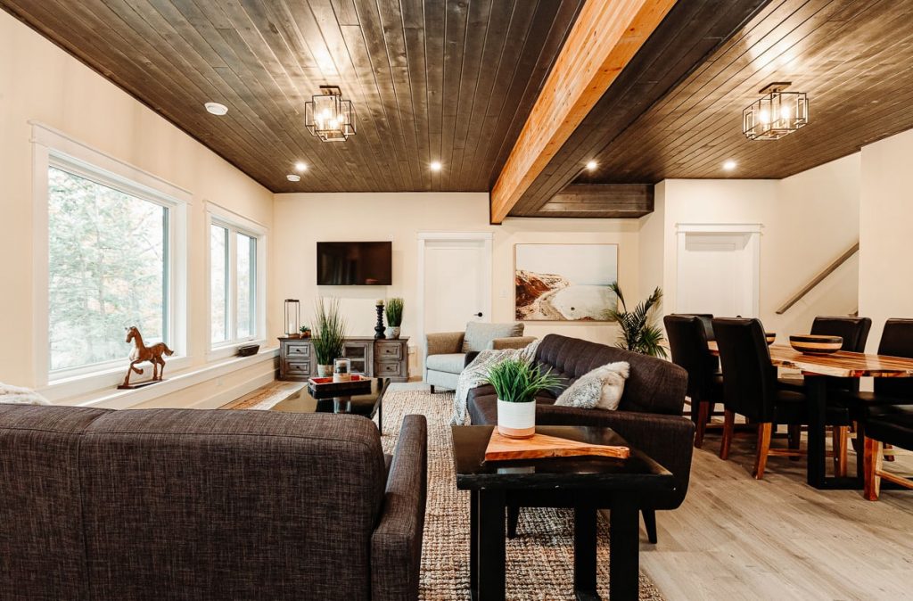 The Newboro 2 post and beam is a modern two-level 3,160-square foot home with three bedrooms, three bathrooms, a full kitchen, and a spacious family room on the lower level and a spacious great room on the main level.