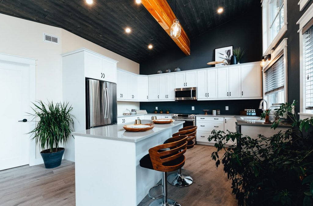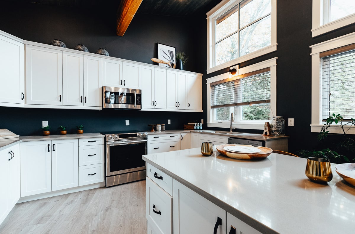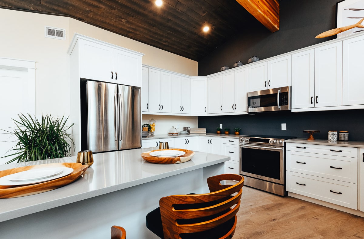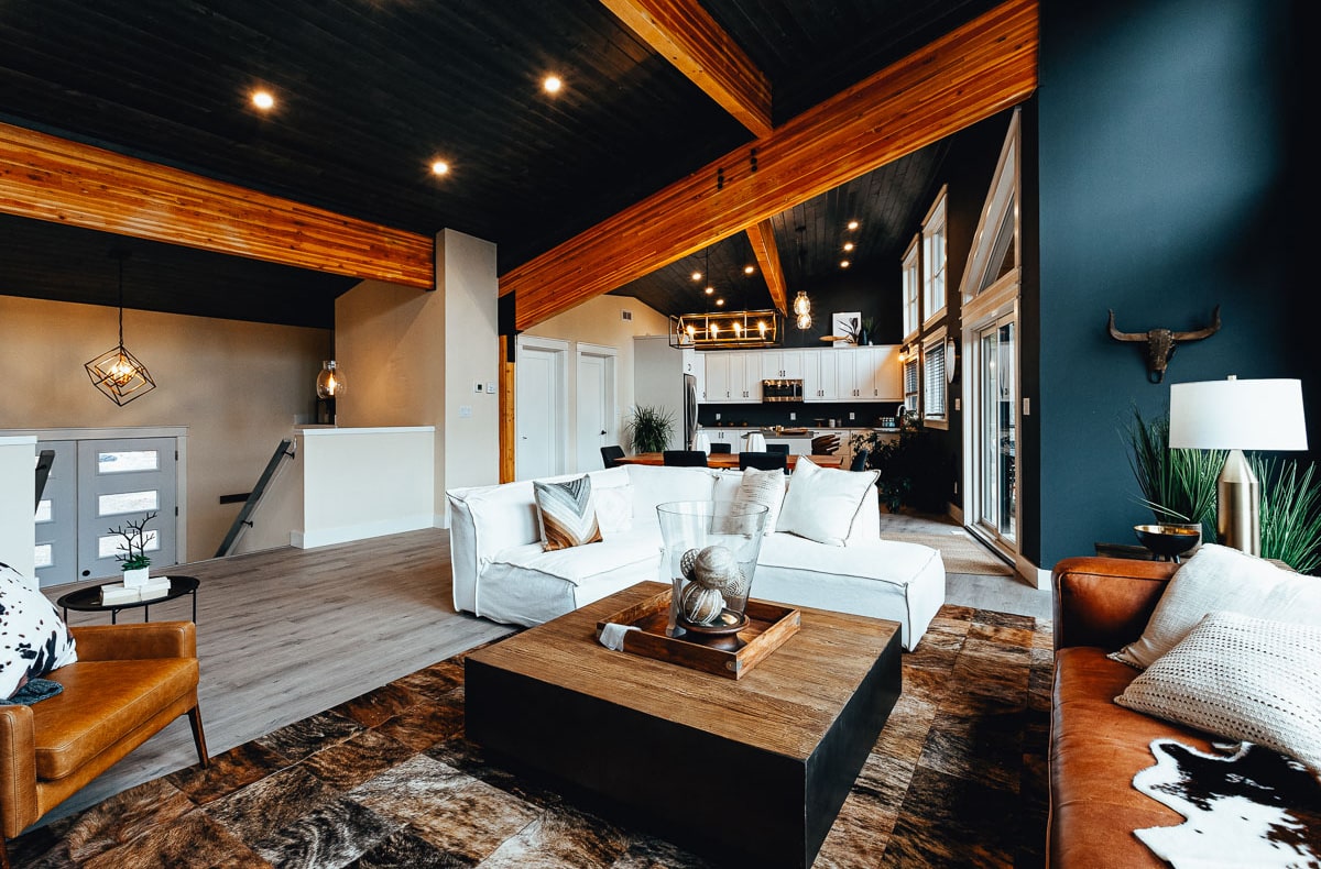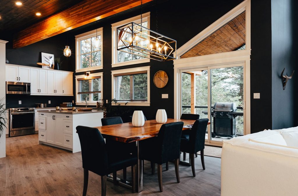 A huge open kitchen with well-designed kitchen island and dining area are featured in the Newboro 2 modern post and beam home.