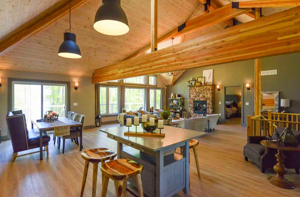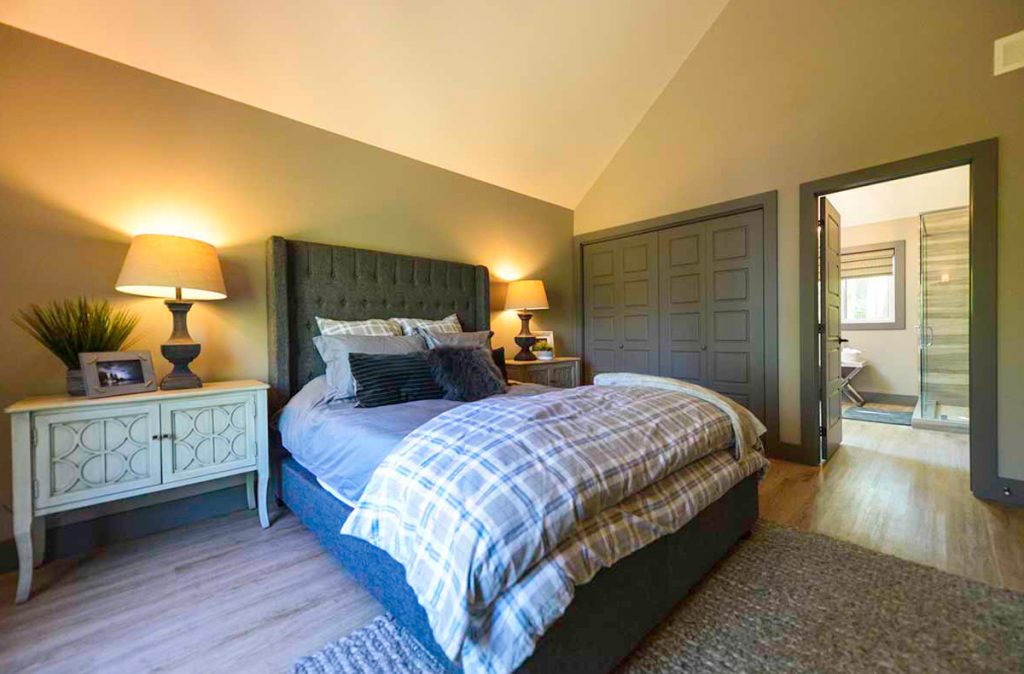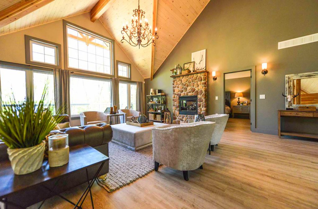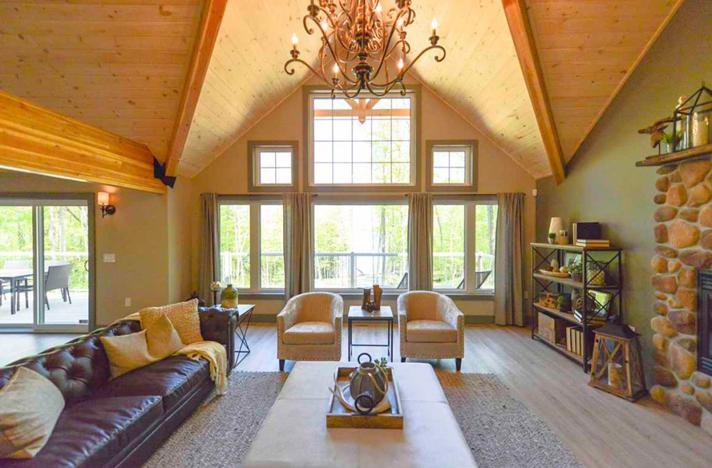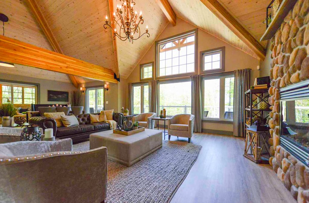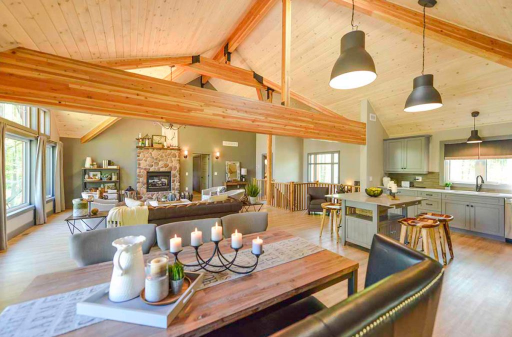 The Selwyn Post and Beam custom home package features expansive open living areas with beautiful exposed glulam beams throughout. The main floor includes a spacious master bedroom suite, and a large covered porch that extends the living space outdoors.