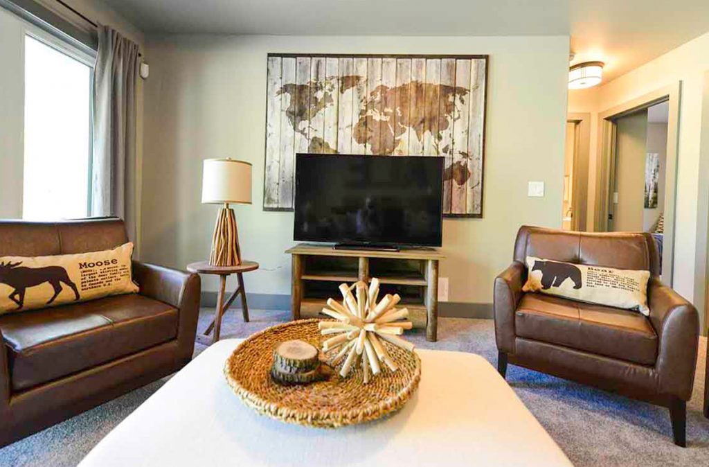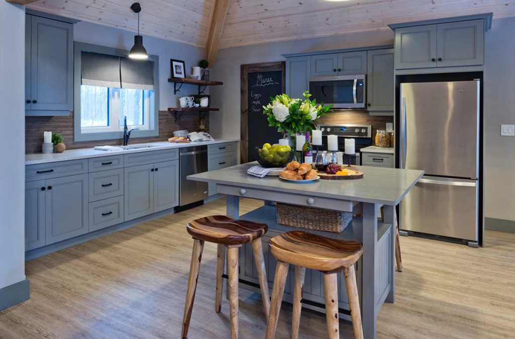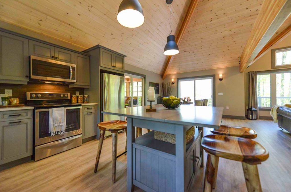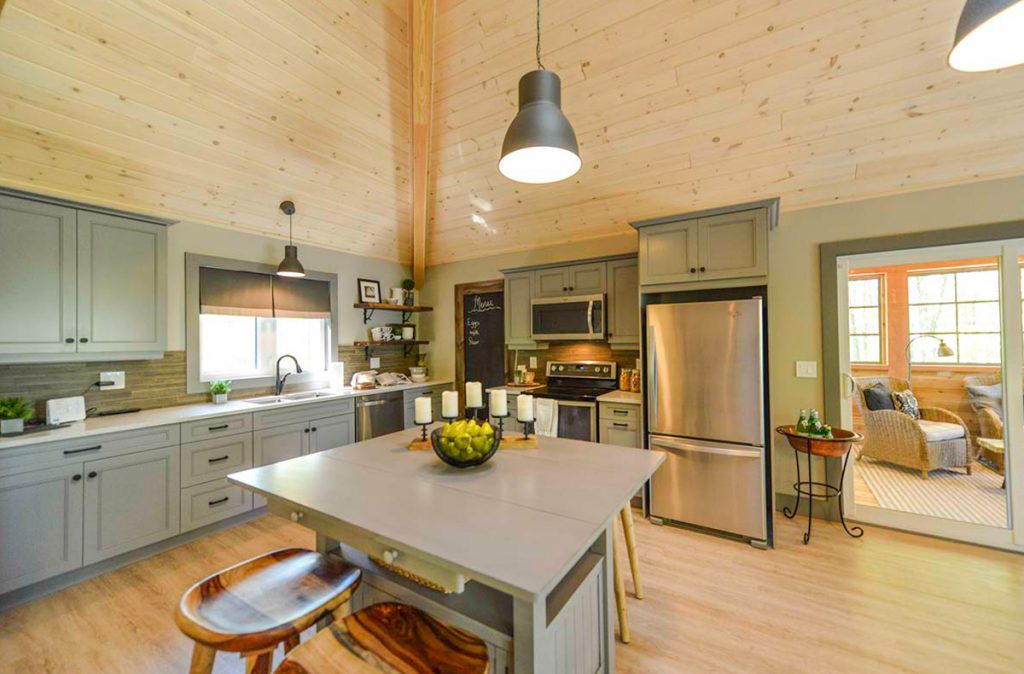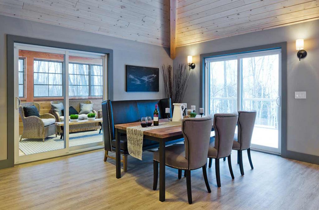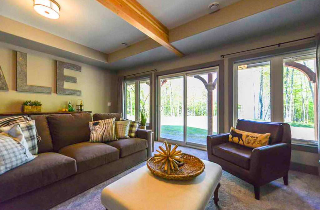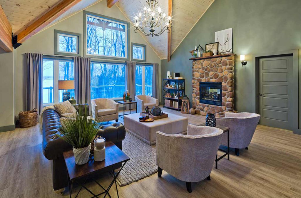The Selwyn Post and Beam custom home package features expansive open living areas with beautiful exposed glulam beams throughout. The main floor includes a spacious master bedroom suite, and a large covered porch that extends the living space outdoors.